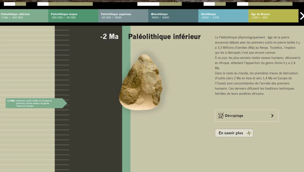 Cette frise chronologique couvre environ 800 000 ans, du Paléolithique ancien à nos jours.